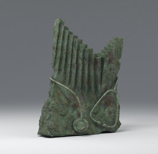 作品造型选取的是敦煌乐器中的“笙”,“笙”是古簧管乐器,发音清越、高雅,结合花的造型再设计,由簧管、斗子、吹嘴三部分构成,笙斗呈圆形,有围匝的形式,吹嘴呈茶壶嘴状,长短不一的花苞型簧管围绕在一起,就如同面对这场突如其来的肺炎疫情,中华民族万众一心,众志成城战胜疫情的决心,“笙”和“胜”同音,我们也终将奏响胜利之声。