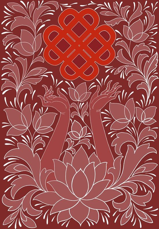 画面以象征“团结、向心、聚力”的中国结为核心,配以一双托举向上的手,意在突出作者对于“同心协力抗击疫情”心愿的表达。主体形象围绕以莲花、缠枝纹样,画面饱满而有张力。莲花纹样是我国经典的传统纹样,寓意“高洁、安宁、祥和”。这幅作品以这些形象组织起来,表达作者对于和谐生活的美好祝愿以及团结协作共克时艰的决心和斗志。