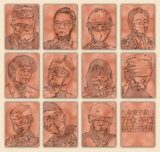 作品中聚焦的是以医务工组者、医学专家、快递小哥、农民工等各行业为战胜疫情辛勤工作的奉献者,面对新型冠状病毒肺炎,我们科学防治、精准施策。作品采用铜板雕刻的技法将人物的内心情感呈现出来,铜板材质的细腻表现,为作品增添了更为真实的人物细节。作品中他们凝聚力量,服务着我们美好的生活,他们每一个人,都是工作岗位上的一员,我们为他们加油,为中国加油。我们万众一心、攻坚克难,在我们共同努力下,必将打赢疫情防控阻击战。