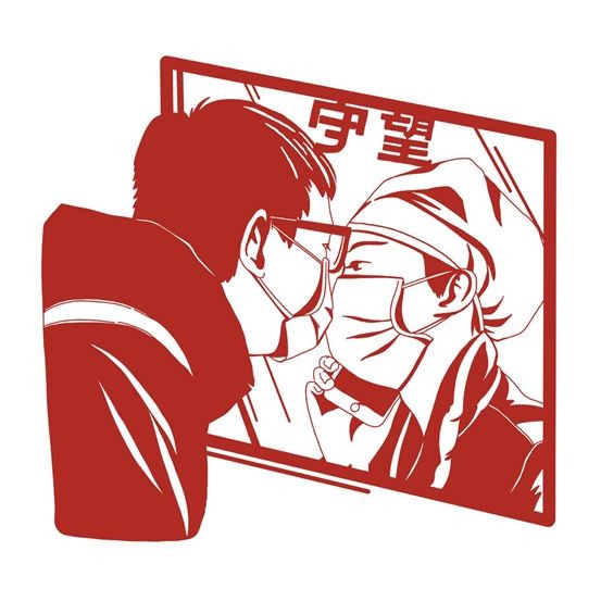 作品运用剪纸的方式表现了一对夫妻隔着医院的小窗户的对望,用手机互相报一句平安,隔离不隔爱。在这次战役里,许许多多的普通人只因一身白衣加入了救援队伍,肩负着责任和使命前往武汉,身后的家人是她们坚强的后盾,支撑着她们在前线战斗。祝愿勇士凯旋,家人健康幸福。