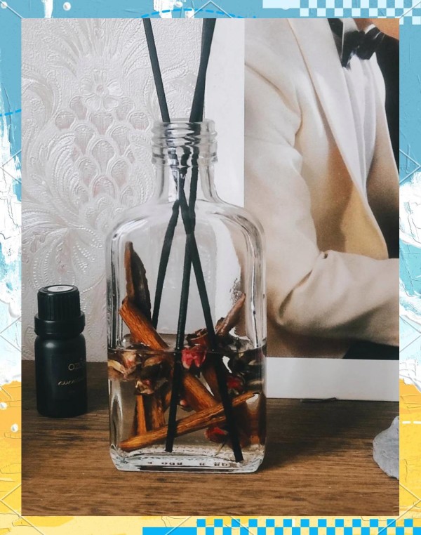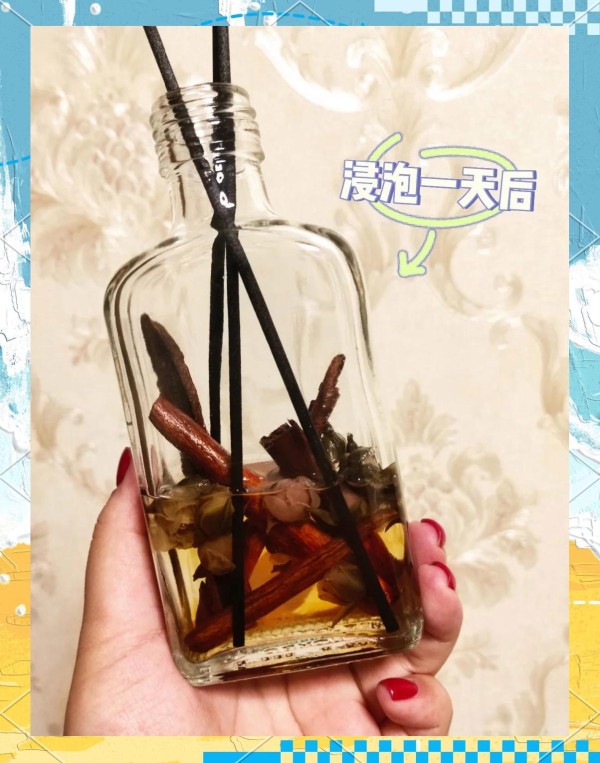 肉桂+玫瑰+橙皮=温暖木香调;若喜欢清甜,可加几滴桂花精油。全部材料塞满瓶身约 70%,留空间让香味循环。封盖后静置一天,香气分子会均匀附着扩香棒,插上通电即可持续散香。