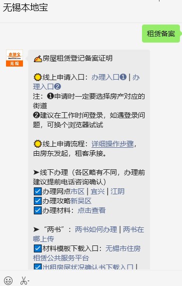 温馨提示:微信搜索公众号【无锡本地宝】,关注后在聊天框回复【租赁备案】查询无锡房屋租赁备案(网上办理入口、材料、线下地址/电话、“两书”办理+如何上传)等。