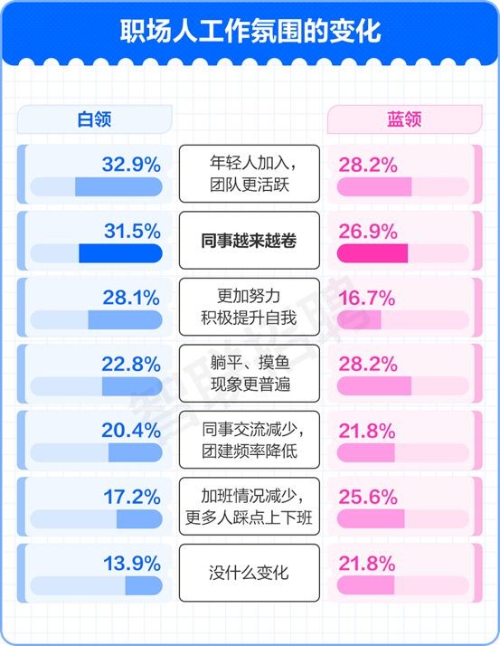 工作压力也折射出大众打工人的公司氛围。31.5%的白领表示同事变得越来越卷,占比高于蓝领;相比之下,蓝领群体的工作氛围比较轻松,躺平、摸鱼现象更加普遍,占比高于白领水平。忙碌之中适当按会儿暂停键,才是“可持续”的工作态度。
