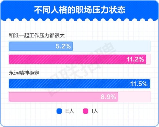 性格决定职场状态,11.5%的E人“和谁相处都能精神稳定”,而11.2%的I人表示“和谁相处压力都很大”。作为“社交悍匪”,E人更能够在职场人际中游刃有余。