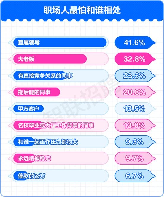 那么,职场人的身边都有谁在“制造压力”呢?41.6%的职场人表示害怕和直属领导相处,32.8%认为大老板让人更有压力。果然领导都自带威慑力光环,走到哪都让人“压力山大”。