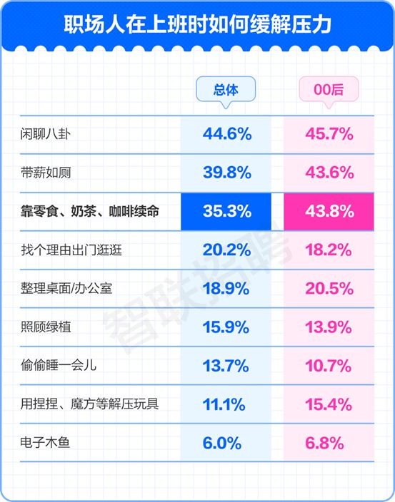 近半职场人上班时靠闲聊/吐槽/八卦解压,00后更需咖啡“续命”超6成职场人下班“刷短视频”解压,男性更喜欢下班打游戏职场发疯文学还在继续,00后“发疯”占比更高超6成职场人靠规律生活改善健康【正文】