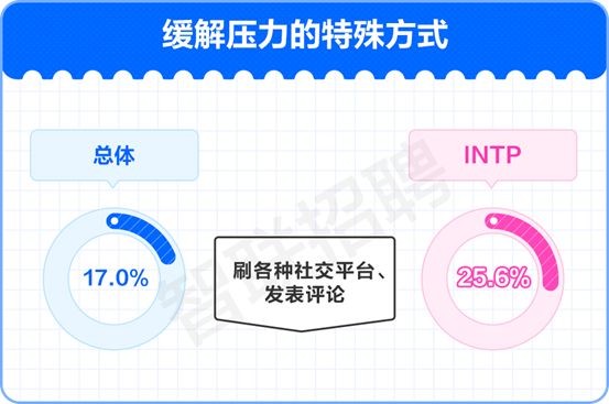 而不同MBTI人格也会影响解压选择,25.6%的INTP(逻辑学家)喜欢在网上发表观点,超过总体的17%。果然,作为“追求真理”的代言人,INTP(逻辑学家)有问题一定要“掰扯”明白。