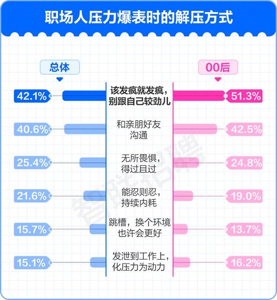 除了日常的解压方式以外,在压力特别大的时候,职场人也都有属于自己的解压小妙招。“发疯”成了最受欢迎的解压方式,42.1%的人选择“该发疯就发疯,别跟自己内耗”。00后倾向于“发疯式”解压的比例高达51.3%,果然年轻人无所畏惧。