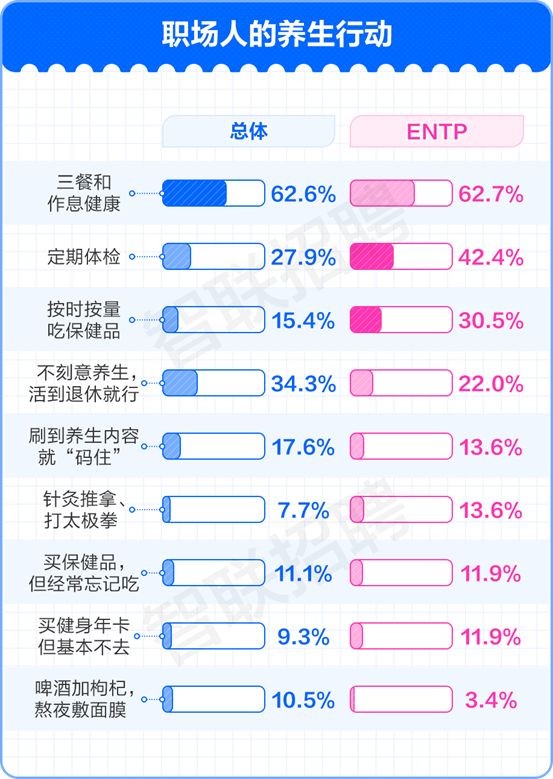 而ENTP(辩论家)完美诠释了则“有压力才有动力”,42.4%定期体检,30.5%按时按量吃保健品,均高于总体水平。对待压力可能带来的健康问题,他们可一点都不敢轻忽。