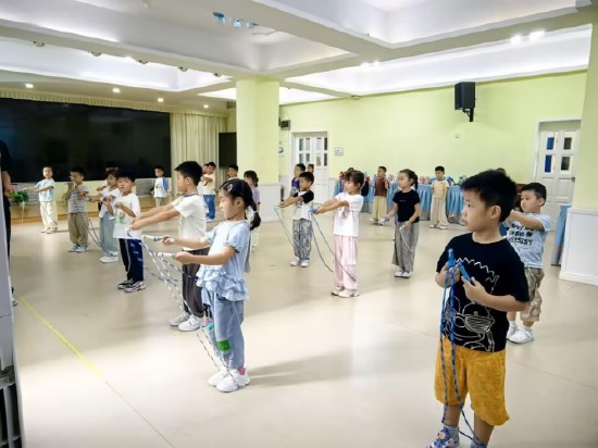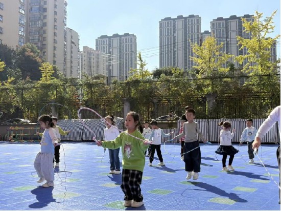 见状,跳得熟练的孩子主动示范,放慢速度展现甩绳、踮脚的要领。其他孩子纷纷组成“互助小组”,有的帮忙调整绳子长度,有的喊着节奏辅助找感觉,有的用手势纠正动作。在同伴的鼓励与帮助下,曾经受挫的孩子重新拿起绳子,从连续跳3下到10下、20下,逐步突破自我;原本吃力的孩子也找到技巧,跳得愈发轻松。操场上,跳绳声、笑声、加油声交织,成为幼儿园里最鲜活的旋律。