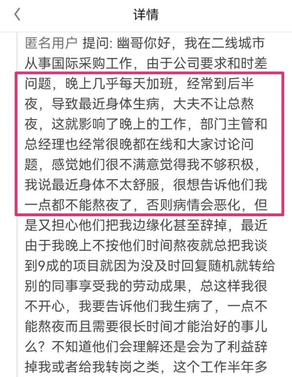 这个采购员工作几乎每天要加班,而且要到半夜即凌晨,她都已经开始生病了,但还是舍不得这份工资。