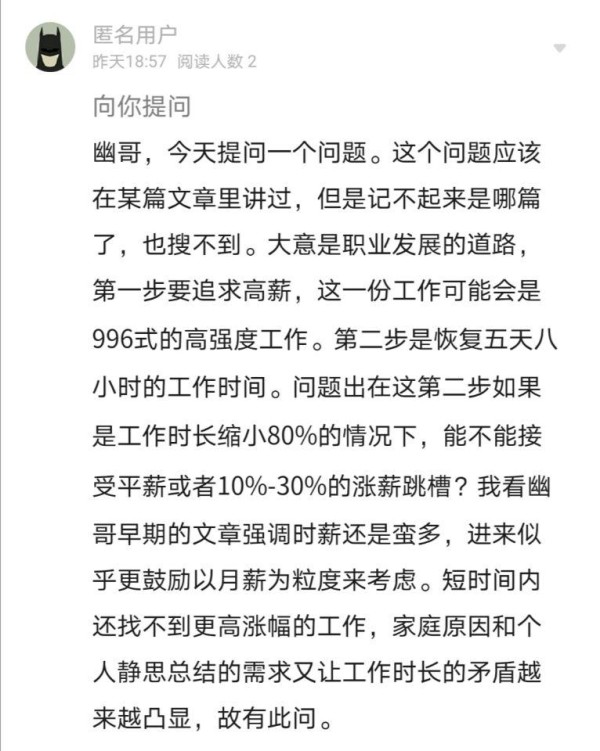 有人老盯着我刚毕业初期跳进上海月薪翻番后的下一步,那一步我是实现了跳到五天八小时工作制,但工资不低于之前996加班制的工资,即时间缩短了(72-40)/72=44%,工资≥过去。
