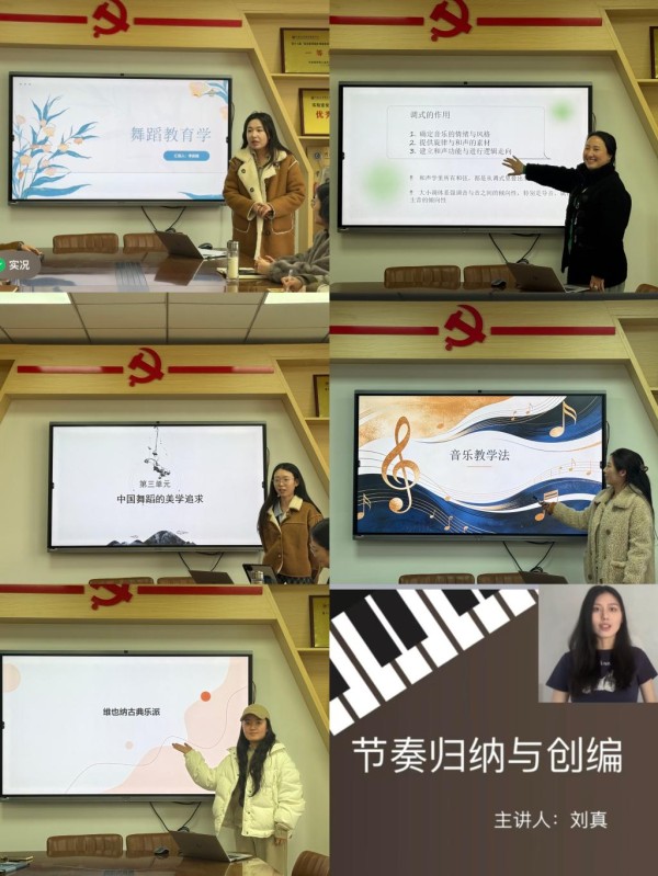 本次新课试讲共有6位教师。他们分别就《音乐教学法》《舞蹈教学法》《音乐创编》《舞蹈美学》《外国音乐简史》《基础和声》等课程的相关章节进行了试讲。担任新课的教师们教态自然,对所讲内容掌握熟练,讲解清晰流畅,能够灵活运用教学手段和方法,充分展现了扎实的专业素养与良好的精神风貌。