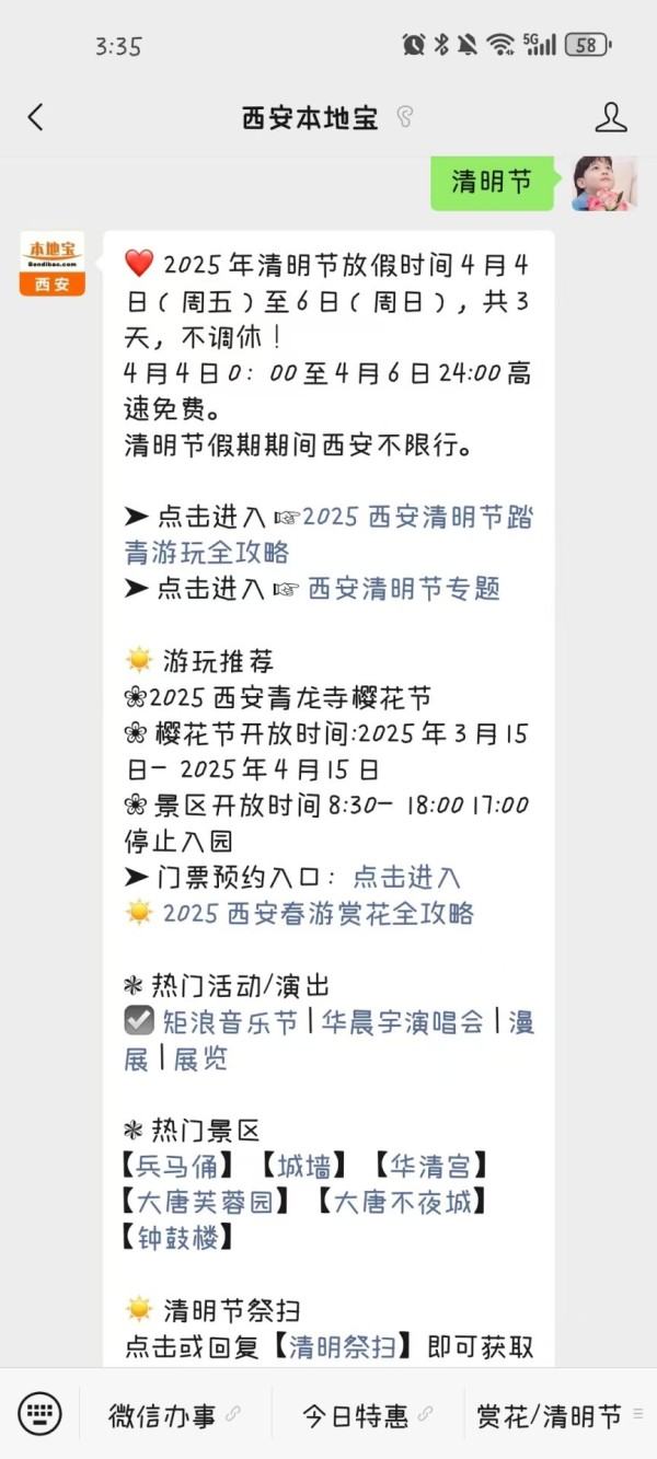 温馨提示:微信搜索公众号【西安本地宝】,关注后在对话框回复【清明节】查看西安清明节各类活动汇总,踏青赏花游玩项目推荐,市内旅游攻略,周边自驾路线,热门景区预约,特惠门票购买,清明节祭扫,公祭等消息。