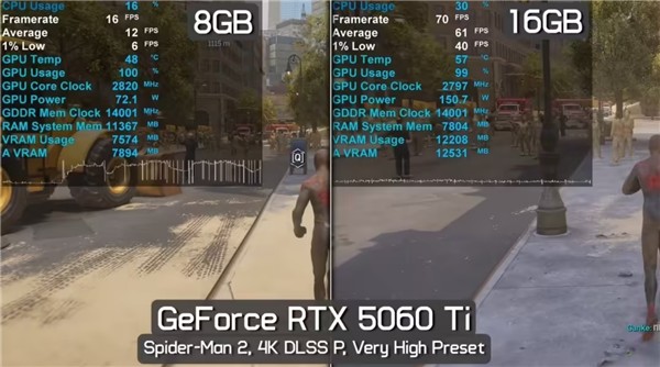 同时显卡价格迎来普涨,TechSpot跟踪10个国家和地区14款当代显卡数据显示,过去三个月其最低现货价格平均上涨15%,RTX 5090全球平均涨幅达32%,印度、波兰更是超50%。而在游戏中,RTX 5060 Ti 8GB版本在《蜘蛛侠2》4K高预设下的帧率也远低于16GB版本,显存不足的短板尽显。