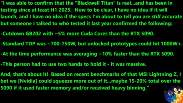 其显存配置尚未最终确认,考虑到32GB以上容量对游戏场景已属过剩,NVIDIA大概率会为其配备48GB显存,兼顾游戏与AI工作负载,将其定位为游戏与AI混合的专业消费级产品。值得注意的是,上一代Titan Ada原型卡最终并未实现商业化,此次的Blackwell Titan上市计划同样尚未确定。
