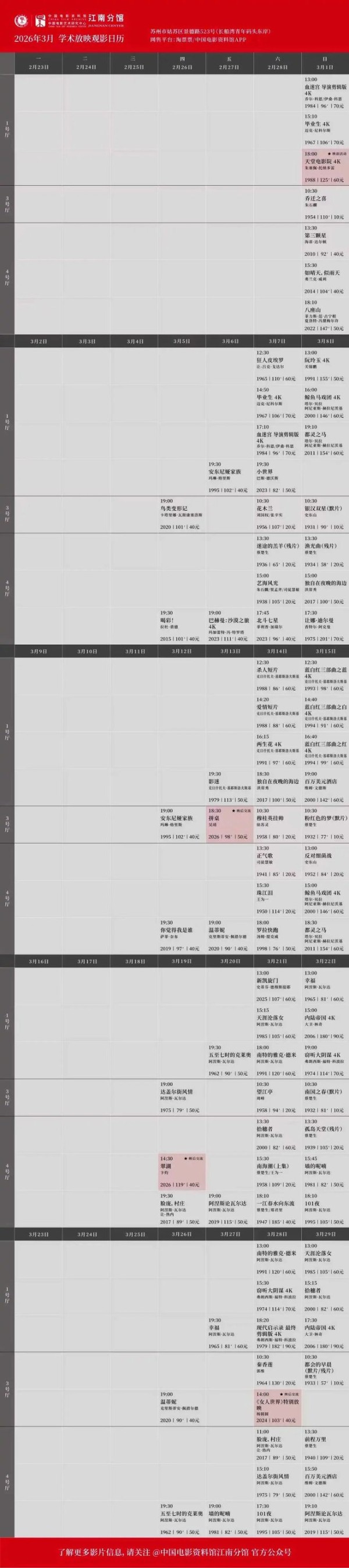 所有场次均可在淘票票、中国电影资料馆APP购票,具体排片见次图,祝大家新年观影愉快。❤️