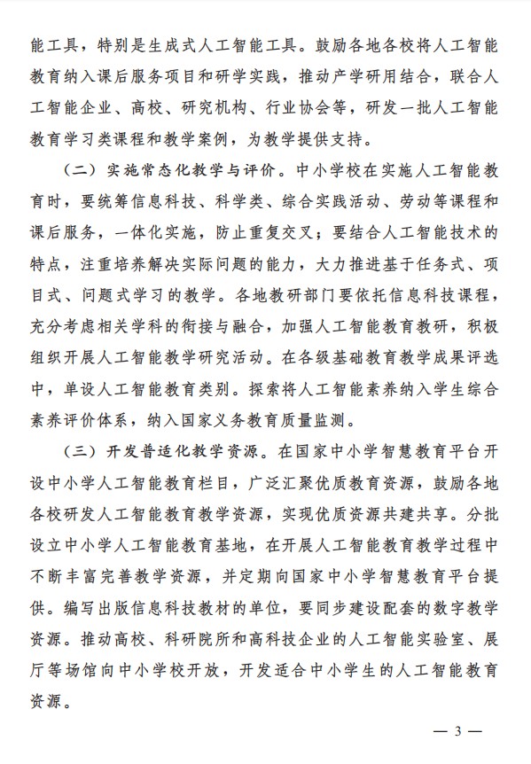 统筹相关课程和课后服务,防止重复交叉。注重培养解决实际问题的能力,推进任务式、项目式、问题式学习。加强AI教育教研,单设 AI教育类别评选。