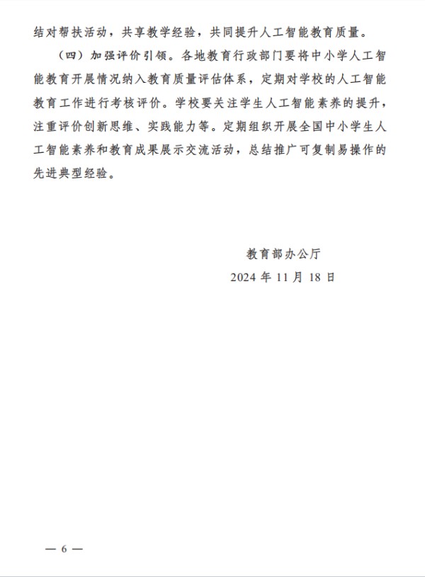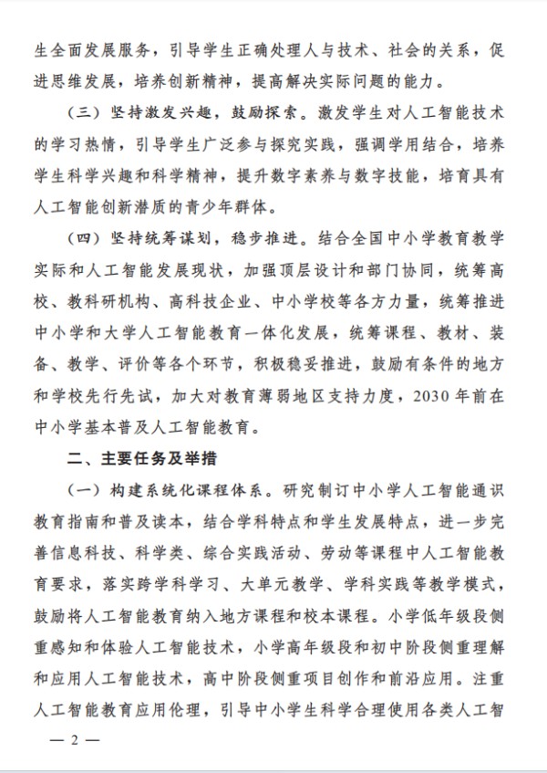 通知强调,要加强顶层设计和部门协同,统筹推进中小学和大学人工智能教育一体化发展,2030年前在中小学基本普及人工智能教育。