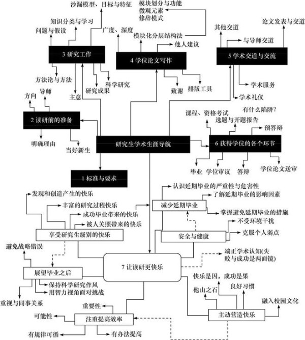 本书的本来目的是帮助研究生更顺利地跨越研究生学术生涯的各个阶段。为了更有效地实现此目的,用本书内容构建研究生学术生涯导航图也许有一定帮助作用。将上述七大章各大节提纲的关键词放在一幅图上,下图就是这样一张这样的导航图,其中第1 条没有展开,第7 条给了更多细节。