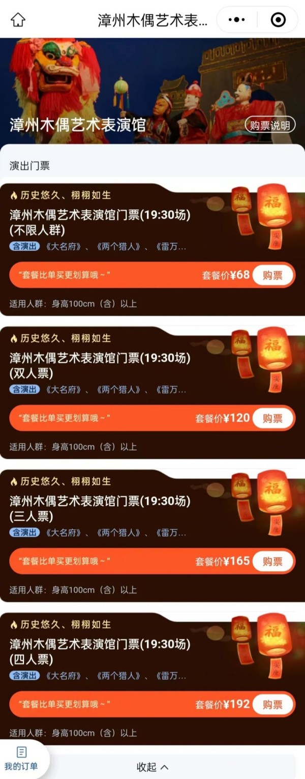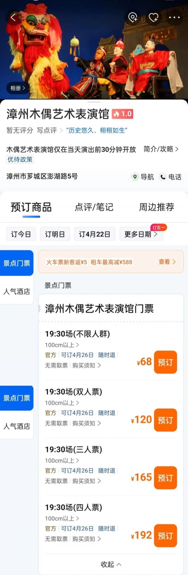打开携程APP,在首页搜索栏输入“漳州木偶”或“漳州木偶艺术表演馆”,即可一键直达购票页面。