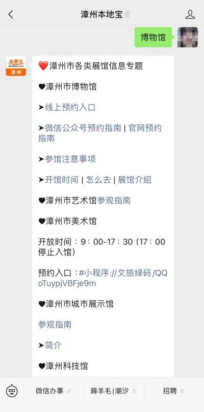 温馨提示:微信搜索公众号【漳州本地宝】,关注后在对话框发送【博物馆】可直达漳州市博物馆预约入口,还可获取漳州市各展馆开放最新消息、预约入口、最新活动等。