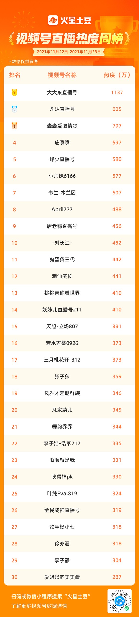 而“凡达直播号”感觉有点要拿下“千年老二”这个名号的意思,这已经是他第三周排在热度榜第二名了,本周热度为805万,较上周相比有所下滑。而之前蝉联冠军的“淼淼爱唱情歌”本周仅拿到了797万的热度,排在第三,期待重回巅峰时刻。