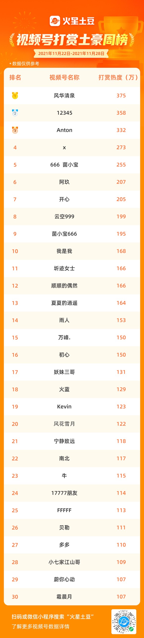 视频号直播打赏土豪周榜