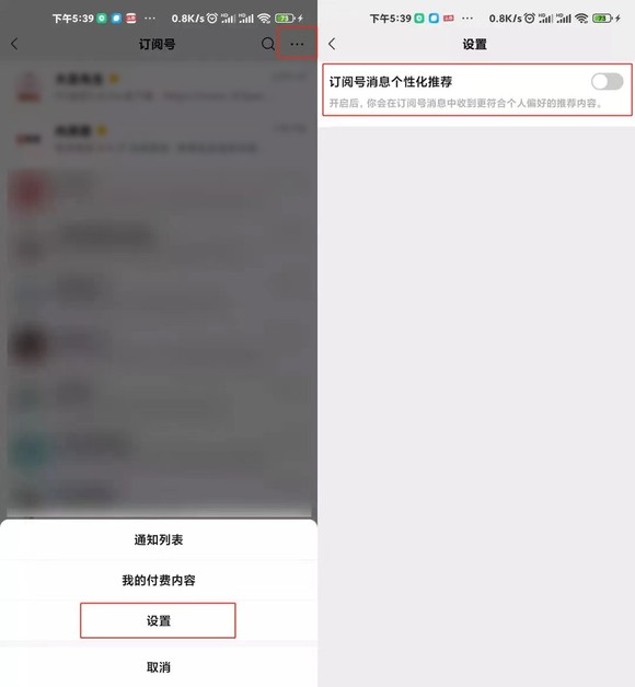 此外,在“订阅号消息”切换列表模式的情况下,点击右上角的“...”,通过新增的“设置”按钮,可以选择是否关闭“订阅号消息个性化推荐”,默认为开启。但或许是因为正在内测阶段,功能还未完善。