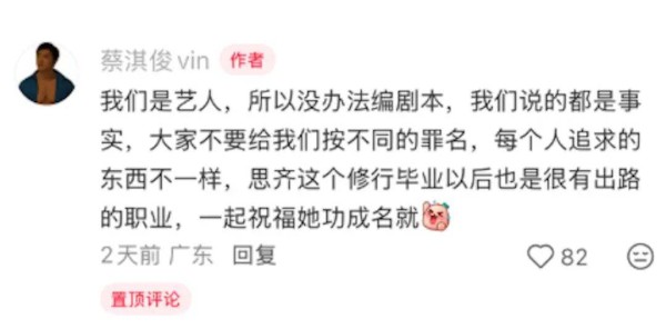 前段时间,陈思齐在透露离队原因时就明确表示,自己是为了修行学习以及规划另外的职业生涯。这次,蔡淇俊也在留言区真诚地强调,他们虽然都是艺人出身,没办法像编剧本那样去演戏,说出来的全都是事实。