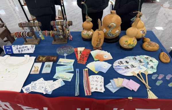 活动现场,教育与艺术系师生精心布置了非遗手作成果展区,一件件精美的葫芦烙画、剪纸作品、漆艺团扇、文创周边等依次陈列。葫芦烙画作品以刀为笔、以火为墨,将花鸟、人物等传统题材刻画得栩栩如生;剪纸作品线条灵动、寓意吉祥,展现了民间艺术的质朴韵味;漆艺团扇则将天然大漆的流光溢彩与现代设计巧妙融合,扇面“诸事顺遂”“半夏”等书法题字传递着美好期许。这些作品均出自教育与艺术系师生之手,是系部长期深耕非遗技艺、践行“以美育人、以文化人”教学理念的生动体现。