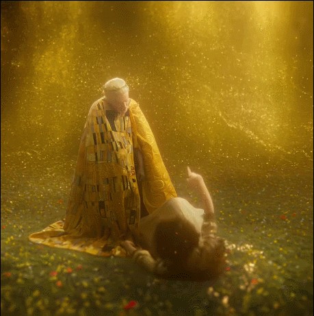 预告里,身披黄金格纹披风的并非年轻恋人,而是一位老者。他俯身亲吻怀中红裙女子后,竟不是紧紧相拥,而是将其抛下,任其坠入机械感十足的冰冷花丛。这一“坠落”与“分离”的关键设计,彻底消解了原作中“拥吻”的浓烈爱意。朦胧的金色雾气还在,但氛围已从爱情的甜蜜或忧愁,急转直下为一种关于衰亡、眷恋与离别的暗黑叙事。乐评人火速解读:这分明是在构建一个“死亡爱情”的故事隐喻。