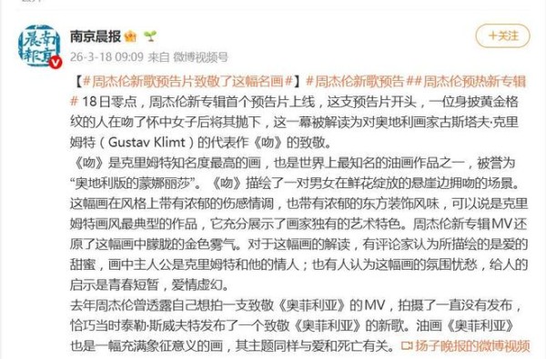 3月18日凌晨,周杰伦发布新专辑第一支预告,瞬间点燃网络。然而,让粉丝们直呼“高级”的,不仅是“周氏美学”的回归,更是预告中对奥地利绘画大师古斯塔夫·克里姆特经典名作《吻》的大胆解构与颠覆。