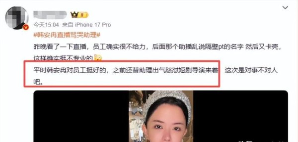 这段被转去各个平台后,网友的态度直接劈成了两半。不少人站韩安冉,说助播确实太不专业,拿了工资就得做好活,本来几万网友看着直播,连基本的台词都记不住,这不就是摸鱼敷衍吗?换自己当老板,碰到这种拖后腿的队友也照样压不住火。还有人翻出旧料,说韩安冉平时对底下员工不算差,之前还为了自己助理跟短剧导演刚过,替员工出头,这回纯粹是被气狠了才没控制住,就是对事不对人。