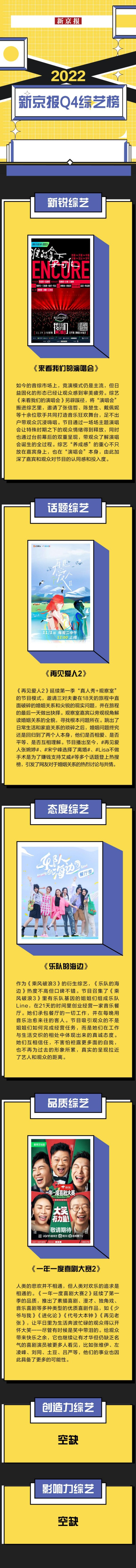 新京报梳理了2022年9月至11月开播的热门综艺节目,根据节目质量、内容导向、观众口碑、播出热度等维度,评选出“新京报2022年Q4综艺榜”。