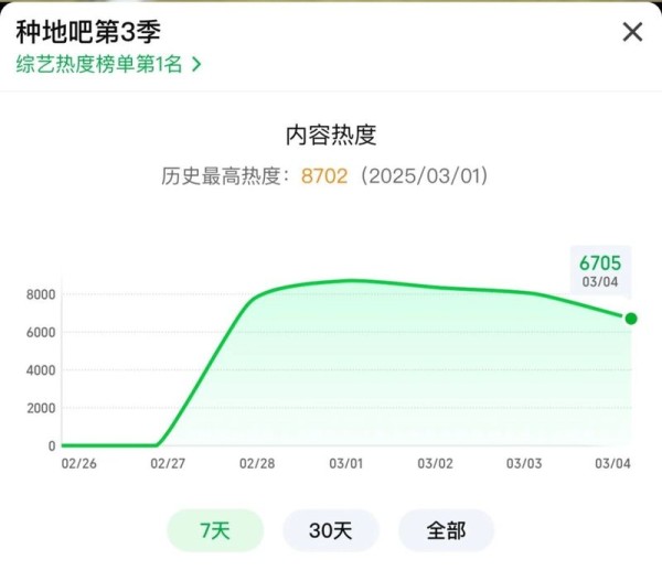 爱奇艺劳作纪实综艺《种地吧3》自2月28日上线以来,内容热度与讨论度持续攀升,节目上线首周站内热度峰值达8702,创下《种地吧》三季以来热度值新高。