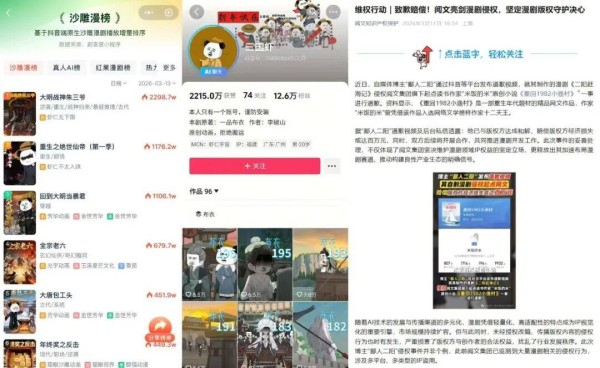 “但现在做沙雕漫的人也少了。”FX说,一方面在于平台政策调整。去年9月,沙雕漫的头部大号“三国虾”被禁言。随后,广电总局发布了动画微短剧管理新规,要求对内容加强导向。今年,沙雕漫的侵权账也在被追诉。近日,博主“鄙人二阳”因抄袭阅文小说赔钱道歉。