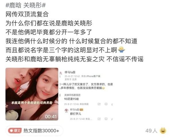 仔细分析,这场所谓的复合传闻并不成立。首先,爆料中提到“双方均为三字姓名”,而鹿晗的名字明显只有两个字,这一点就和实际情况严重不符。
