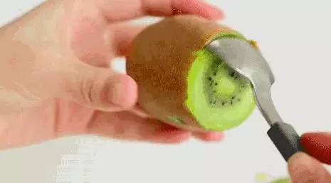 将猕猴桃用水果刀切掉一段,切面大小视勺子(勺壁较薄)能插入的口径而定,将勺子沿着猕猴桃果皮转一圈,果肉果皮就完美分离啦!