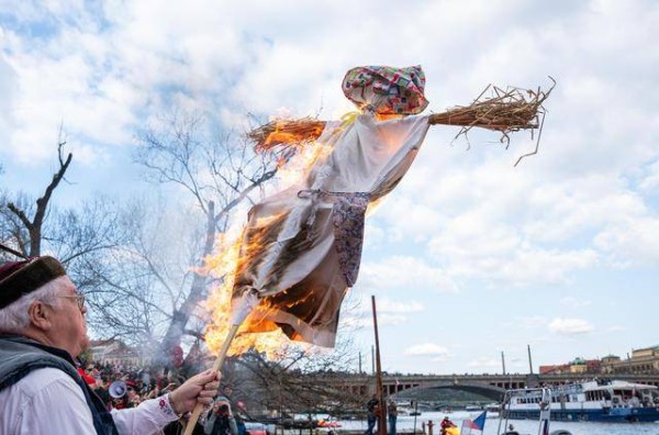 3月22日,捷克布拉格举行传统迎春活动。人们在活动中将象征着寒冬与死亡的稻草人焚烧后投入河中,意味着告别冬天,迎接春天的到来。
