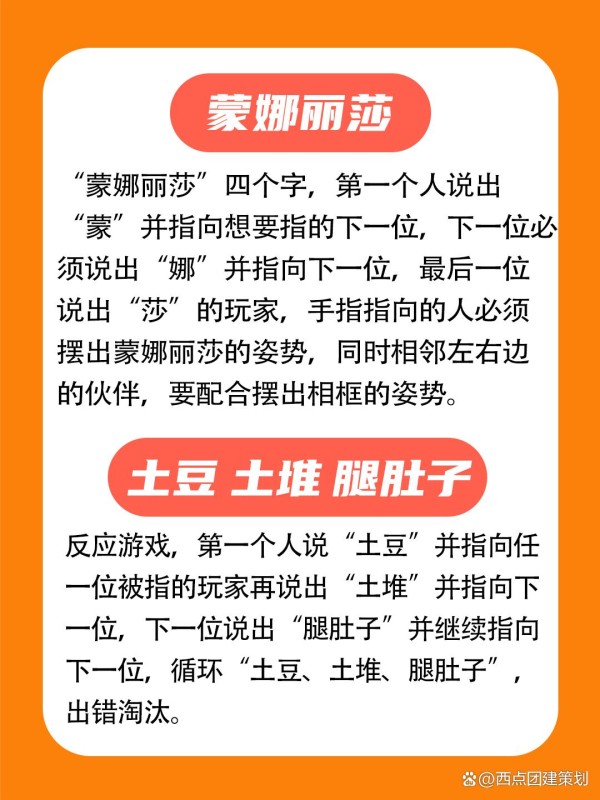 游戏规则:“蒙娜丽莎”四个字,第一个人说出“蒙”并指向想要指的下一位,下一位必须说出“娜”并指向下一位,最后一位说出“莎”的玩家,手指指向的人必须摆出蒙娜丽莎的姿势,同时相邻左右边的伙伴,要配合摆出相框的姿势。