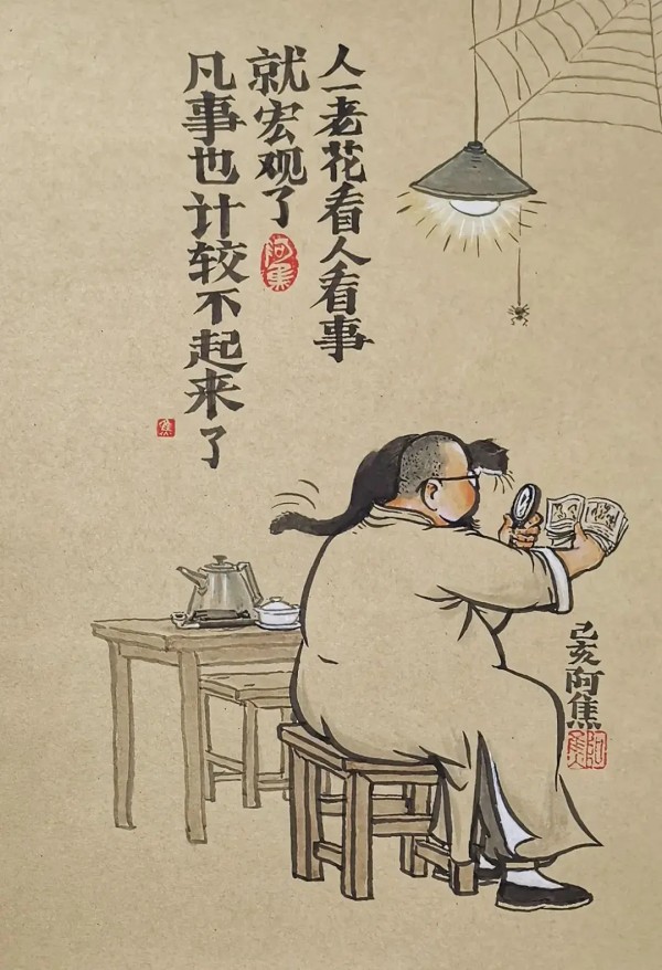 他笔端下倾诉的漫画画面,无论是立体感还是代入感,都让人有身临其境的感同身受,无论是在大街小巷,还是在茶余饭后,胖胖的中年大叔总是悠闲着自在着,观己观物,或自自嘲解压生活或笑看红尘万象,他的画里的醉意能够乾坤通透,他的月朗风清充满了生活的日常琐碎,即便是直面生活的一脸愁云,也自带舒朗快意,心花放纵,童趣的率真欢欣,直透纸面。