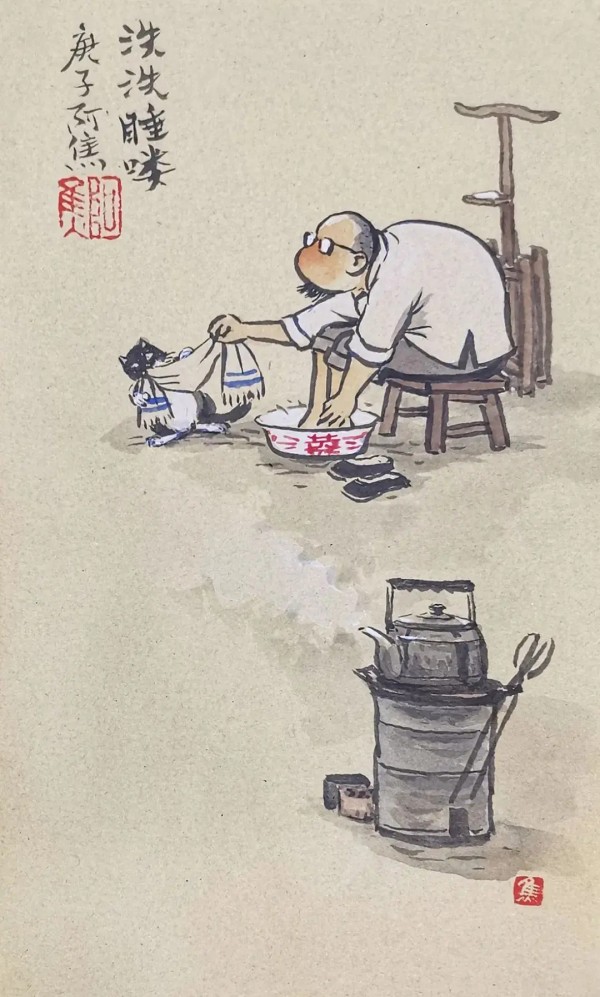 在《早洗早睡》这幅漫画里,他写道:黑妞莫闹,早洗早睡,明天还需庸碌前行,人潮人海,有你有我,赶着自己的人生,远大理想是有房有车有爱人,有孩子操不完的心,代代传承……对着画面里的煤球炉子和茶壶,木凳黑猫擦脚毛巾,还有弓腰搓脚和黑妞戏谑玩耍的中年胖大叔,真觉得:生活可爱还需你宠,时光温柔还要你懂。