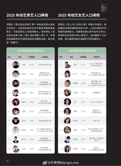 影响力综艺作品TOP10:乘风2025、演员请就位第三季、歌手2025、五十公里桃花坞第五季、脱口秀和Ta的朋友们第二季、再见爱人第五季、一路繁花、地球超新鲜 、现在就出发第三季、喜人奇妙夜第二季
