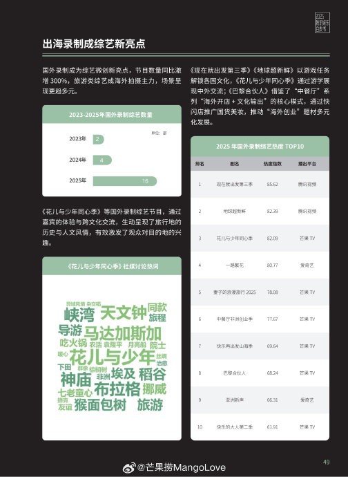 国外录制综艺热度TOP10:现在就出发第三季、地球超新鲜、花儿与少年同心季 、一路繁花、妻子的浪漫旅行2025、中餐厅非洲创业季、快乐再出发山海季、巴黎合伙人 、亚洲新声、快乐的大人第二季