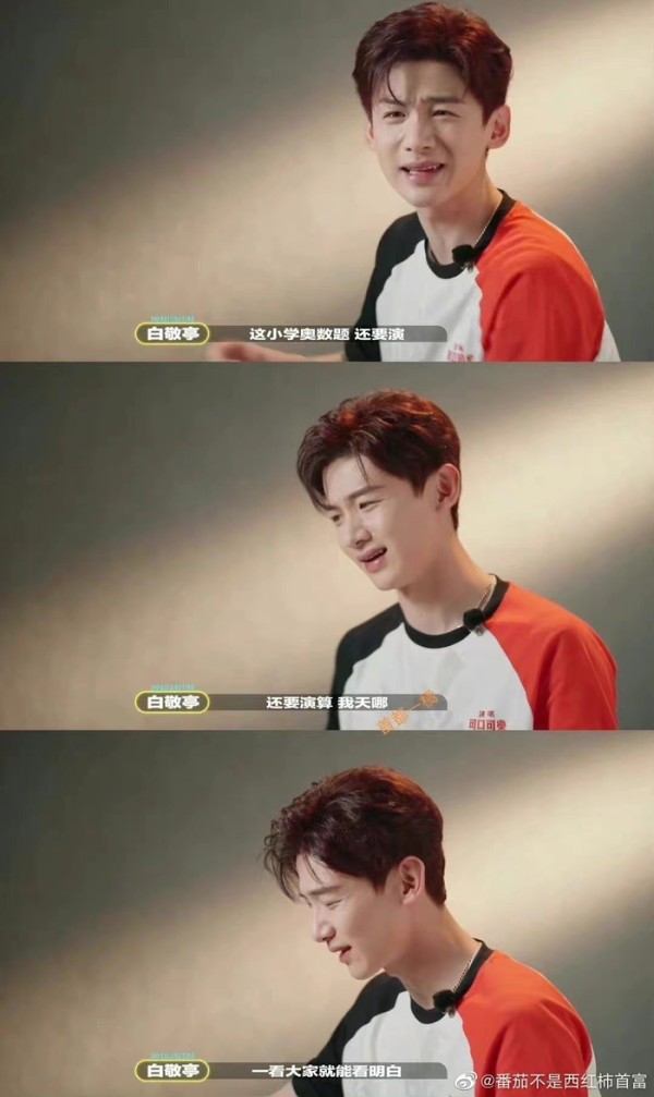 比如成功令白敬亭被冠上“天才”称号的一个闯关环节,节目组给出的题目是一道数学题。题目中以嘉宾头像代替数字给出了5条等式,最后让白敬亭根据这五条等式算出所有嘉宾头像加在一起等于几。