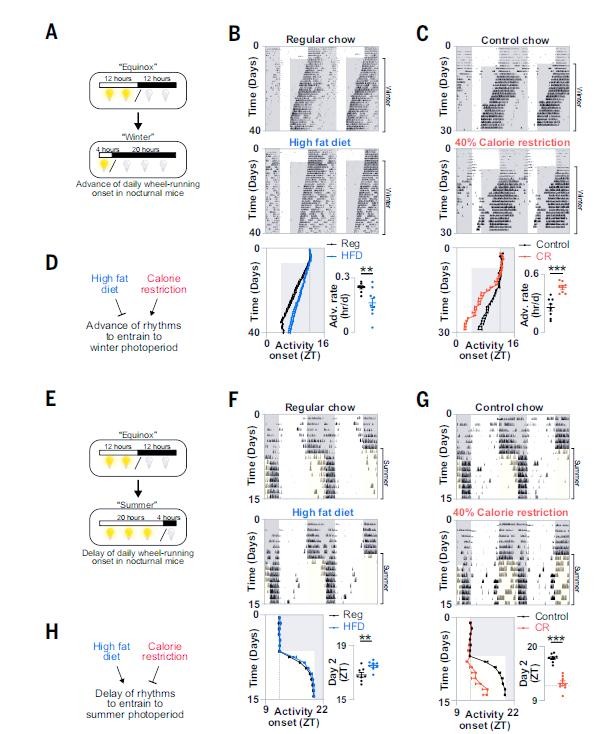而在夏季适应方面,普通饲料小鼠需要4天才能延迟节律以适应夏季更短的黑夜,而高脂饮食小鼠更快地做出了反应,仅在2天内就多延迟了1小时。然而,热量限制的小鼠在夏季适应方面却表现出较慢的速度,2天内仅延迟0.5小时,最终未能完全同步。