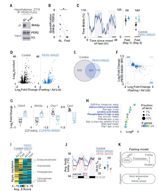 在禁食状态下,小鼠的活动模式会发生变化,它们会在黑暗期早期集中活动,并在黑暗期末段进入短暂的静止状态,这种行为模式的改变受到下丘脑核团和生物钟的精密调控。为了探究这一现象背后的分子机制,我们特别关注了 PER2-S662磷酸化在这一过程中的作用。