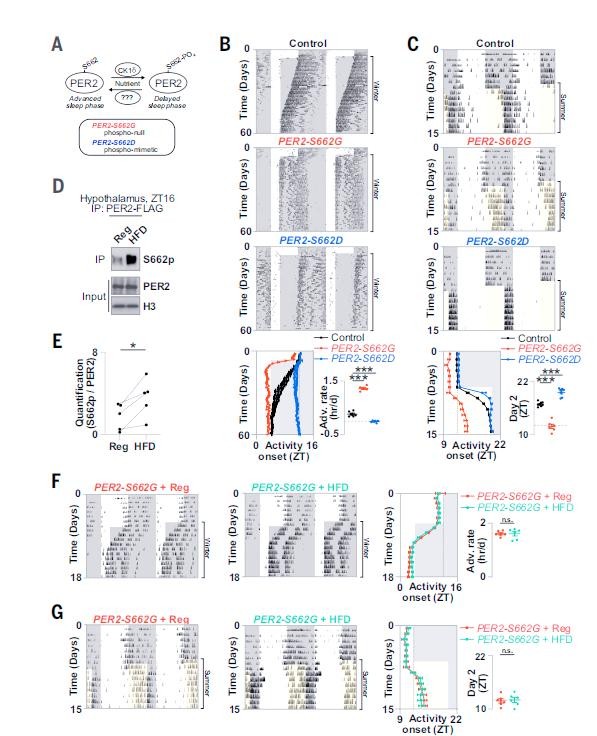 为应对一年四季昼夜长短的变化,生物钟的振荡周期需要作出相应调整。这种调整对于生物在季节更替中的生存至关重要,尤其是食物和能量的供应会随着季节的改变而发生变化。研究团队发现,一种名为 PER2的蛋白质在其丝氨酸662位点(PER2-S662)的磷酸化状态,对小鼠和人类的生物钟节律调整产生了显著影响,同时这一过程还受到营养状态的调控。
