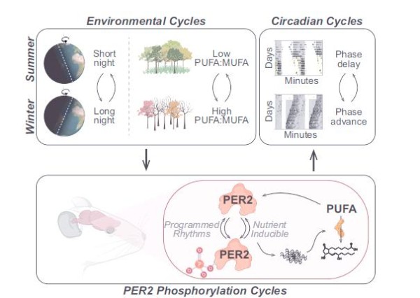 昼夜节律、饮食时间与外界的光暗循环密切相关,它们共同构成了维持机体健康的重要基础。饮食中脂肪酸的种类和比例,可能作为一种关键的环境信号,通过影响 PER2-S662的磷酸化水平,协助生物钟感知季节更替并相应地调整生理节奏。